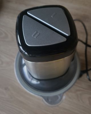 Bol mezclador de acero inoxidable 304. 4 cuchillas desmontables Capacidad: 1,5l Medidas: 19cm (ancho) x 24cm (alto) 2 velocidades Base con goma antideslizante Muy fácil de limpiar Funciona perfectamente