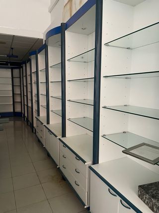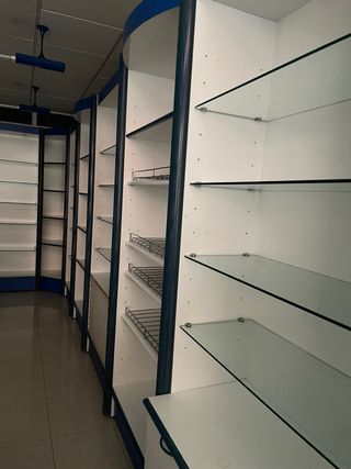 Se venden estantes de vidrio con estructura metálica y detalles en plástico. - Estantes de vidrio transparente. - Estructura de metal resistente. - Acabados en blanco y azul.