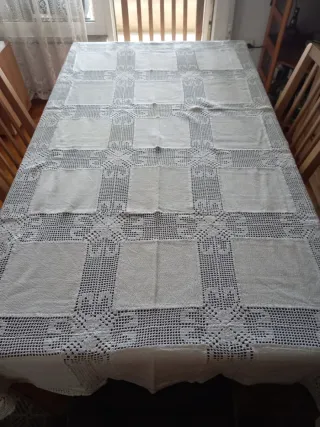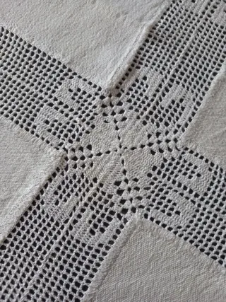 Antigua mantelería de algodón con borrado de crochet a mano. Medidas 220 x 125 cms. Nuca se ha usado, pero ha estado tiempo guardada por lo que tiene 3 o 4 manchitas amarillas (ver última foto), pero se quitan fácilmente con blanco nuclear. - Patrón de cuadrados de tela intercalados con motivos florales de crochet. - Bordes festoneados con elegantes detalles de encaje. - Aporta un toque clásico y artesanal a tu mesa.