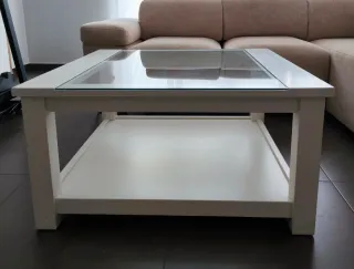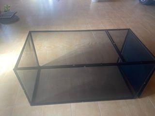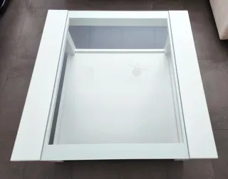 Mesa de centro cuadrada con superficie de cristal y estructura de madera. - Medidas: 90x90 cm. - Diseño moderno y funcional. - Buen estado. Solo tiene alguna marca propia del uso.