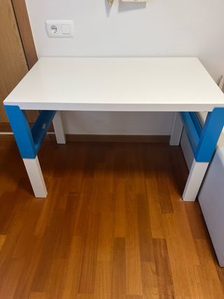 Escritorio juvenil con un diseño moderno y funcional. - Estructura robusta. - Acabado en blanco y azul. - Regulable en altura ( altura máxima 71cm. - Dimensiones 96x48cm