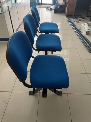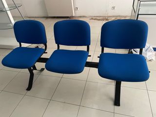 Conjunto de tres sillas para sala de espera. - Estructura metálica. - Asientos y respaldos tapizados en tela azul.
