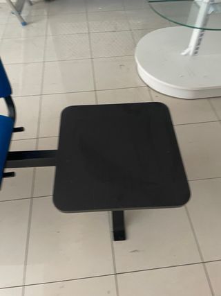 Conjunto de sillas de espera con asientos y respaldos tapizados en tela azul y estructura metálica negra. - Diseño moderno y funcional. - Ideales para recepciones o áreas de espera. - Incluye una pequeña mesa auxiliar negra.