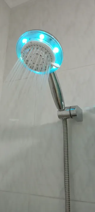 Alcachofa de ducha con luces LED integradas que cambian de color. El diseño combina acabados plateados y detalles en multicolores. - Luces LED. - Diseño moderno.