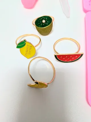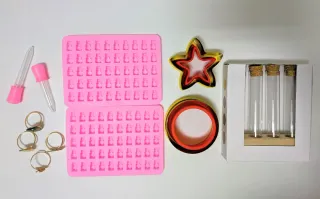 Lote compuesto por: - Dos moldes de silicona de ositos para gominolas o chocolate, con sus correspondientes pipetas. - 4 servilleteros en forma de anillas doradas con frutas. - 2 moldes cortadores, uno de estrella y otro circular. - Set de 4 tarros para especias.