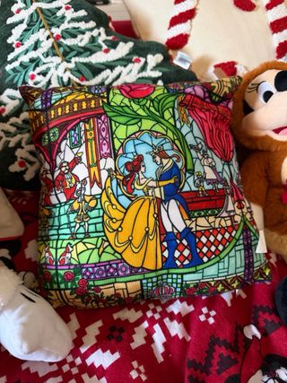 Cojín con relleno. Diseño de la vidriera de La Bella y la Bestia de Disney. Medidas: 12x12cm. Está nuevo. El relleno se lo puse yo misma, lo mando incluido. - Representación de los personajes principales. - Estilo vitral colorido y detallado. - Aporta un toque mágico a cualquier espacio.