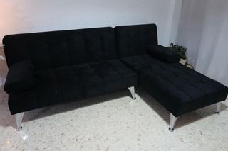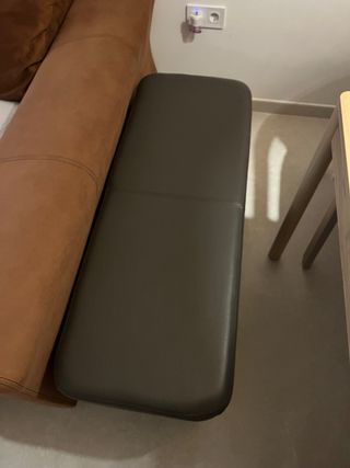 Chaiselongue de tela en color gris, con unas medidas de 255x90 cm. Chaiselongue mirándolo de frente lo tiene a la derecha, muy usado con algún desperfecto, para una segunda oportunidad. Con dos puff