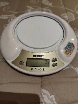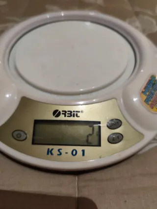 Balanza de cocina digital marca Orbit, modelo KS-01. Ideal para pesar ingredientes con precisión. - Diseño compacto y moderno. - Pantalla digital clara. - Botones de unidad y tara.