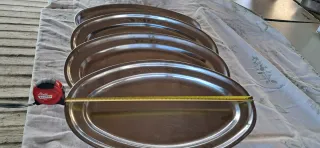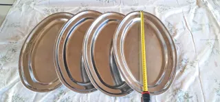 Conjunto de cuatro bandejas ovaladas de acero inoxidable. - Diseño elegante y duradero. - Ideales para servir alimentos.