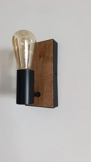 Lámpara de pared con un diseño industrial que combina materiales. - Base de madera con acabado rústico. - Soporte y detalles en metal negro. - Bombilla de cristal tipo Edison. - Posibilidad de comprar las dos. Ver más en mi perfil.