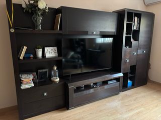 Mueble de salón modular en buen estado, con un diseño elegante y funcional. - Combinación de módulos son 4 - Acabado en tonos oscuros.