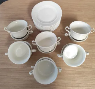 Elegante juego de consomé de 24 piezas. - Diseño clásico y refinado. - Apto para lavavajillas. - Apto para microondas.