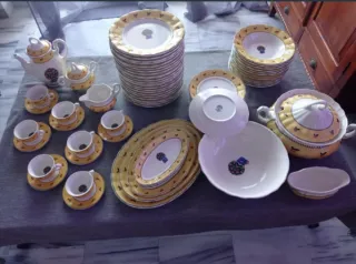 Conjunto de vajilla de porcelana de La Cartuja, edición especial. - Diseño con detalles en amarillo y blanco. - Incluye platos llanos, hondos, de postre, ensaladera, sopera y fuentes