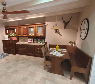 Banco rinconera de cocina con un estilo rústico y acabado en madera. - Diseño de esquina. - Acabado en tono madera natural.