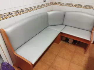 Rinconera de cocina de madera, ideal para aprovechar el espacio. - Diseño clásico y funcional. - Acabado natural de la madera. Se regalan cojines. Tiene una parte rota, se puede ver en las fotos. La pare rota no impide su uso. A recojer en Mutxamel.