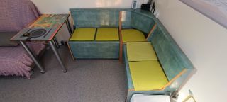 Se vende banco con respaldo de madera chapado en verde para cocina, caravana, barbacoa con gran capacidad (30cms) del interior para almacenamiento o como despensa. Medidas 142X135X83cms altura total y 52cm ancho del asiento con cojines en verde clarito, se puede desmontar en tres módulos, en perfectas condiciones de uso y estética. En la actualidad instalada en una autocaravana. Por su peso y dimensiones se aconseja la venta en persona. - Diseño en L. - Cojines de asiento en color verde clarito. - Estructura principal en color verde.