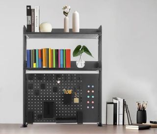 Organizador de escritorio versátil para mantener tu espacio de trabajo ordenado. Su diseño moderno se adapta a cualquier estilo. - Estructura metálica robusta. - Paneles perforados para colgar accesorios. - Compartimentos para almacenamiento adicional.
