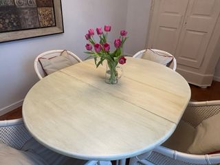 Elegante conjunto de comedor con mesa ovalada y cuatro sillas. - Mesa de comedor con estructura de madera clara. De 4 plazas pero Extensible a 6 plazas - Sillas de ratán en color blanco con cojines. - Diseño clásico y atemporal.