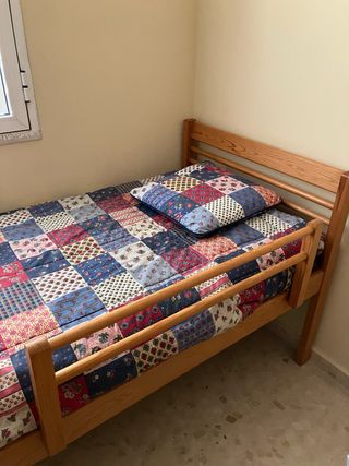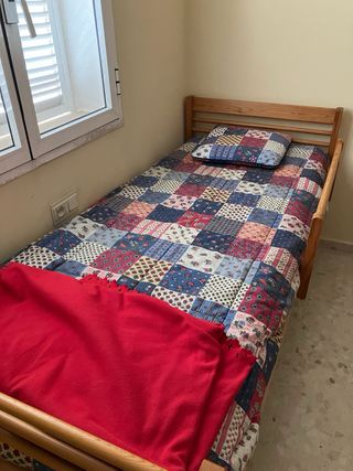 Se vende cama individual con su colchón y edredón. Somier de laminas. Colchon Flex - Estructura de madera. - Edredón con diseño patchwork multicolor - Cortina store a juego