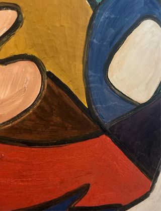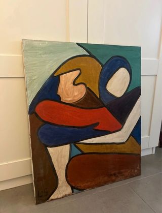 Pintura abstracta con formas geométricas y colores vibrantes. - Estilo moderno. - Tonos tierra y azules predominantes.