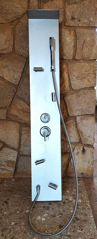 Columna de ducha con un diseño moderno y elegante. - Panel de ducha plateado y blanco. - Fabricada en metal y plástico. Precio 25€ Miguel 659 246 199