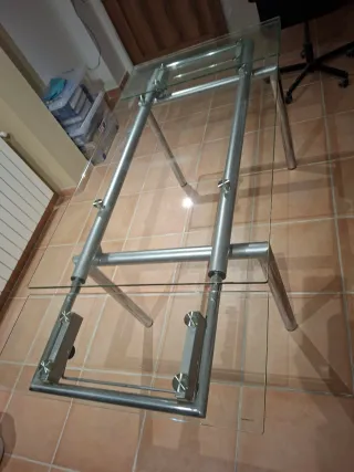Elegante mesa de comedor con superficie de cristal y estructura metálica, extensible 140-200, ancho 80 y altura 75. - Diseño moderno y minimalista. - Patas de metal plateado. - Tablero de cristal transparente.