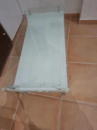 Elegante mesa de centro con un diseño moderno. - Encimera de cristal. - Base de metal y madera blanca - Patas metálicas.