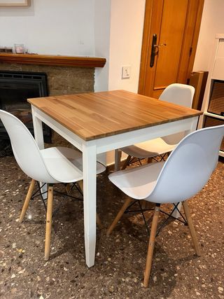 Mesa cuadrada con sobre de madera y patas blanca. Tiene un desperfecto en uno de las patas. Solo es la mesa, las sillas no.