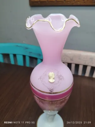 ⚠️NO NEGOCIABLE⚠️ jarrón de cristal opalino con un delicado diseño vintage en tono rosa. Presenta detalles dorados y una figura ornamental. - Borde superior ondulado con ribete dorado. - Detalle de cameo en relieve en la parte frontal. - Banda decorativa en color fucsia con motivos dorados. ALTURA 33 Cm. ★★SE HACEN ENVIOS POR WALLAPOP★★ GRACIAS. MUEBLES MESAS SILLAS SILLONES SOFAS DECORACIÓN VAJILLA PORCELANA FRANCESA LIMOGES SARREGUEMINES BAVARIA LA CARTUJA DE SEVILLA PICKMAN COPAS CRISTAL VASOS CHINO CHINA JAPON CUCHILLOS CUCHARAS TENEDORES COLECCIÓN ANTIGUA ANTIGUO HOME RETRO.
