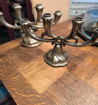 Elegante pareja de candelabros de plata esterlina alemana 835 sellada con la media luna y la corona, tmbien el sello del platero jakob grimminger. Peso total: 1772 gr. 20cms x 33cms. Tiene contrapeso, sin posibilidad de quitarlo. El de 477gr de la última foto se vendió en subasta por 900€ solo uno.
