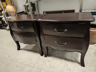 Par de mesitas de noche con un diseño clásico y elegante. Perfectas para añadir un toque de estilo a tu dormitorio. - Acabado en madera oscura. - Dos cajones con tiradores. - Patas curvas. - Diseño con frente curvo.
