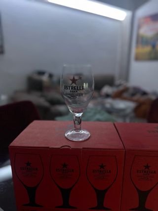 Set de 24 copas de la marca Estrella Damm. Perfectas para disfrutar de tu cerveza. - Diseño elegante y distintivo. - Material de cristal de alta calidad.