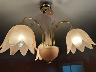 Elegante lámpara de techo con un diseño inspirado en flores. - Acabado en dorado y detalles en rosa. - Tulipas de cristal translúcido. - Base y brazos de metal. 🌸 Vintage Pink Lotus Flower Ceiling Lamp – Elegant Retro Lighting 🌸 Beautiful and romantic vintage-style ceiling light with three soft pink lotus flower shades in frosted glass. Accented with gold/brass-tone arms and center fixture, it adds instant charm to any room — perfect for vintage, Hollywood Regency, or shabby chic interiors. ✨ Details: • 3 lotus-style pink glass shades • Gold/brass-tone mount and arms • Fully functional – tested and working