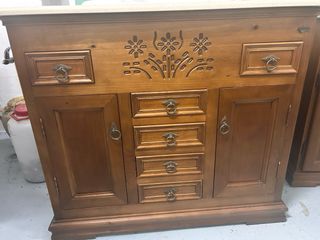 Mueble de baño con encimera de piedra y estructura de madera. - Diseño con detalles tallados. - Incluye cajones y puertas de almacenamiento. - Mirando el mueble de frente, en la parte izquierda tiene un toallero en color plata. - El cajón de arriba, en la parte izquierda, por la parte de dentro está un poco estropeado, pero nada que no puede arreglarse, con algún protector de cajón. - Es de la marca RUSTIBAÑO. - Se vende por cambio de estilo del baño, y como se puede ver, tiene un estilo rústico. - No tiene espejo.