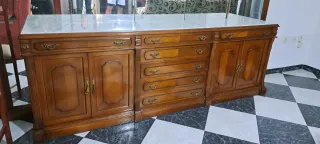 Mueble aparador de madera con un elegante sobre de mármol y un espejo integrado. - Diseño clásico y funcional. - Acabado en madera oscura. - Encimera de mármol blanco.