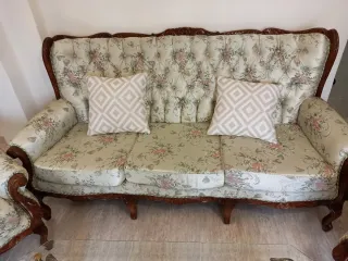 Conjunto de salón compuesto por un sofá y dos sillones. - Tapicería de tela con estampado floral. - Estructura de madera tallada. -