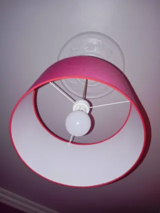 Dale un toque moderno a tu habitación! Vendo lámpara de techo con un diseño único, ideal para dormitorios juveniles, despachos o salones que busquen un aire contemporáneo. Características principales: • Diseño exclusivo: Estructura de metal cromado con un elegante detalle central en forma de espiral. • Doble iluminación: Cuenta con dos pantallas cilíndricas que proporcionan una luz suave y acogedora. • Estampado sutil: Las pantallas tienen un diseño de círculos concéntricos en tonos neutros, fáciles de combinar con cualquier decoración. • Materiales de calidad: Acabado en cromo brillante que se mantiene como nuevo.