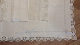 Juego de sábanas de hilo con delicada puntilla de bolillos.no tiene nombre bordado. Mide 225cm de ancho por 280 de largo. Antigua y actual a la vez - Elaboradas con hilo de alta calidad. - Detalle de puntilla artesanal. - Diseño elegante y atemporal.