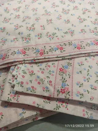 Juego de sabanas vintage para cama de 90. Medidas: Almohadón de 113 cm, encimera de 145×254 cm y bajera no ajustable de 145×238 cm. Sin estrenar. Son antiguas.