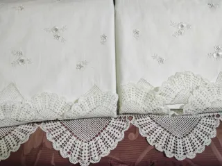 Preciosas sábanas antiguas con detalles bordados. Algodón 100 * 100. - Diseño floral. - Encaje de bolillos en el borde.