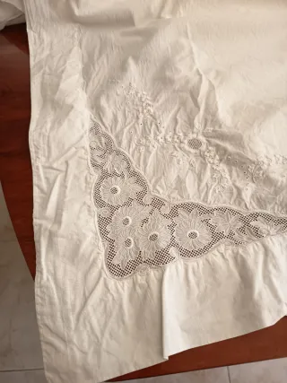 Preciosa sábana antigua con detalles bordados y un bonito encaje. Largo 2,60 Ancho 2,50 En perfecto estado - Tejido de algodon - Diseño floral bordado. - Adorno de encaje en los bordes.
