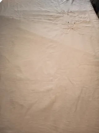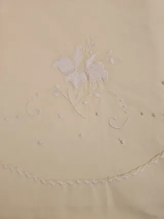 Sábana encimera de lino con un delicado bordado. Medidas 230X190 cm. Adorno de encaje en el borde. Es antigua y tiene 5 pequeñas marcas marrones en la tela, ver ultimas fotos. Hago envíos por Wallapop.