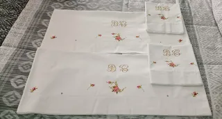 Juego de sábanas antiguas con un delicado bordado floral. 3 piezas, bajera, almohadón y encimera de 135cm