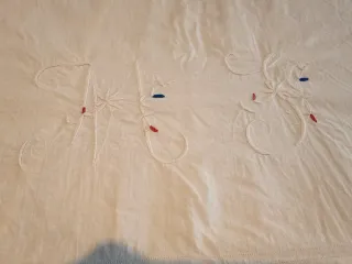 Preciosa sábana antigua con bordados. - Medidas largo 278 x 192 - Diseño de iniciales CT en punto de cruz. - Detalles florales en azul y rojo. - Confeccionada en lino. Tengo más en mi perfil