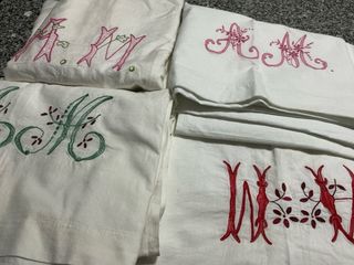 Conjunto de cuatro sábanas con bordados. De lino antiguo - Bordados con las iniciales AM. - Diseño floral en algunos bordados. - Colores de bordado: rosa, verde y rojo.
