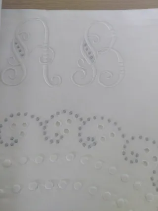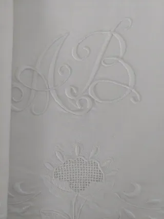 De color blanco con bordado blanco y gris De algodón Antiguo, bordado a mano Compuesto por sabana encimera y funda de almohada Con iniciales bordadas AB Medidas 224 × 208 cm Funda 144 × 44 cm Sin estrenar,guardado muchos años