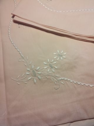 Preciosas sábanas de algodón, en color rosa y blanco. El bordado es delicado y elegante, creando un diseño floral. - Incluye un juego de sábanas. - El bordado es de color blanco sobre fondo rosa. - Tejido de algodón suave. La medida son para cama de 135 son muy antiguas las tengo rebajadas su valor es mucho mayor