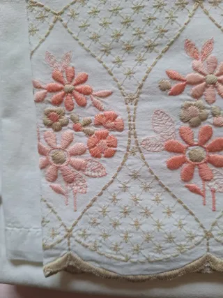 Conjunto de ropa de cama con un delicado bordado floral. - Sábana: 1,60 m ancho x 2,24 m largo. - Funda de almohada: 1,28 m largo.Tengo varios juegos en venta, te puedo hacer lotes a precio especial.