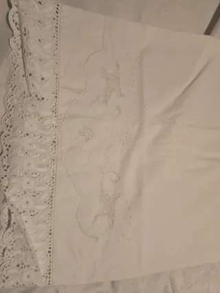 Sábana encimera de algodón blanco, con encaje artesanal ancho cosido y bordado decorativo calado de estilo clásico. Pieza elegante, bien trabajada y difícil de encontrar hoy en día, típica de ajuar antiguo. El encaje es protagonista, con diseño geométrico repetido y muy bien conservado. Ideal tanto para uso como para amantes del textil tradicional o decoración vintage. Incluye: 1 sábana encimera 1 funda de almohada Medidas: Encimera: 180 cm de ancho × 240 cm de largo Funda de almohada: 140 cm 👉 Apta para cama de 105 o 135 cm. Estado muy bueno, sin roturas