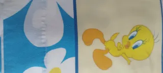 Juego de sábanas con el personaje Piolín, ideal para cama de 90 cm. El diseño presenta a Piolín sobre un fondo amarillo y un borde con flores blancas y azules. Bajera ajustable. - Personaje: Piolín. - Estampado: Flores. - Borde decorativo.